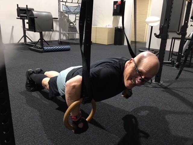 (Photo: Allan Johnson in the gym doing Roman push-ups a couple of months after his 4th heart surgery. Compression stocking still being worn. Under medical supervision.)