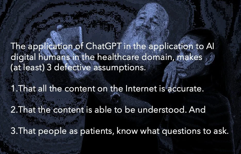 There is a simplistic focus on content and having a digital human ‘talk’ the content: previously screen scrapped, now potentially generated, and regurgitated by ChatGPT. The problem is, the content *is* the problem, and in particular, incomprehensible content from authoritative sources that patients cannot understand. And there is decades of peer reviewed international research on this.